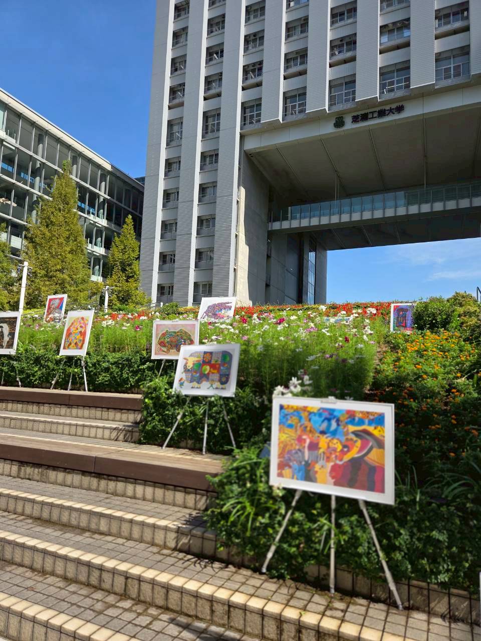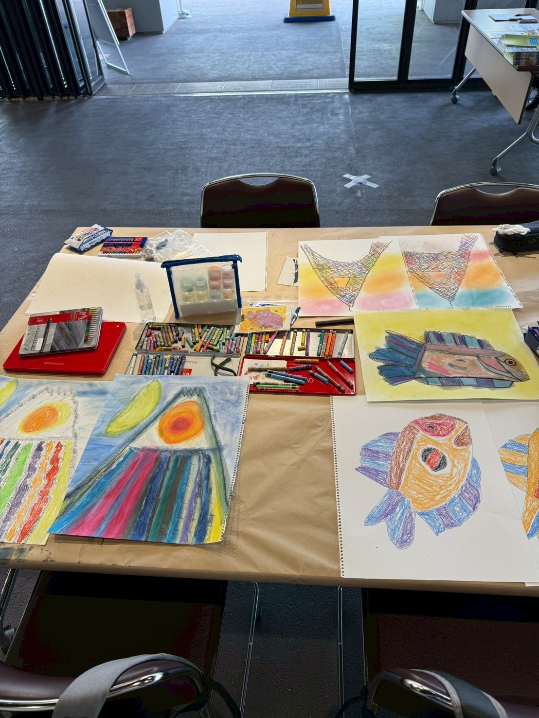 会場内には2台の大きなテーブルが設置されており、ひとつはライブペインティング用、もうひとつは来場者が自由に塗り絵を楽しめる体験テーブルとして準備されていました。周囲には多彩なアート作品が展示され、空間全体が一体となってアートを楽しめる雰囲気に包まれていました。