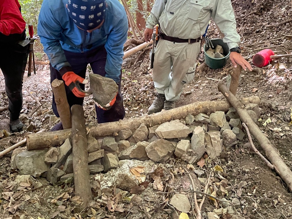 その後は実際の作業に移りました。緑が豊かに見える宮地山ですが、実は内部はカラカラに乾いており、水が染み込むためのつながりが失われているそうです。第1回から継続されている「水の受け皿と通り道づくり」を引き継ぎ、今回は山の中腹で斜面と登山道の補修を行いました。8月の豪雨で斜面が崩れ、登山道を横切る深い溝ができていたため、次の豪雨でさらに崩れたり、登山道が流されたりする危険性が高まっていました。そこで、丸太や石を使って砂防ダムのような仕組みをつくり、水が勢いのまま流れ落ちないよう、自然の力を活かした工夫が施されました。資材は外部から持ち込まず、落ち葉や枝、石など、その場にあるものだけを使って作業を進めています。